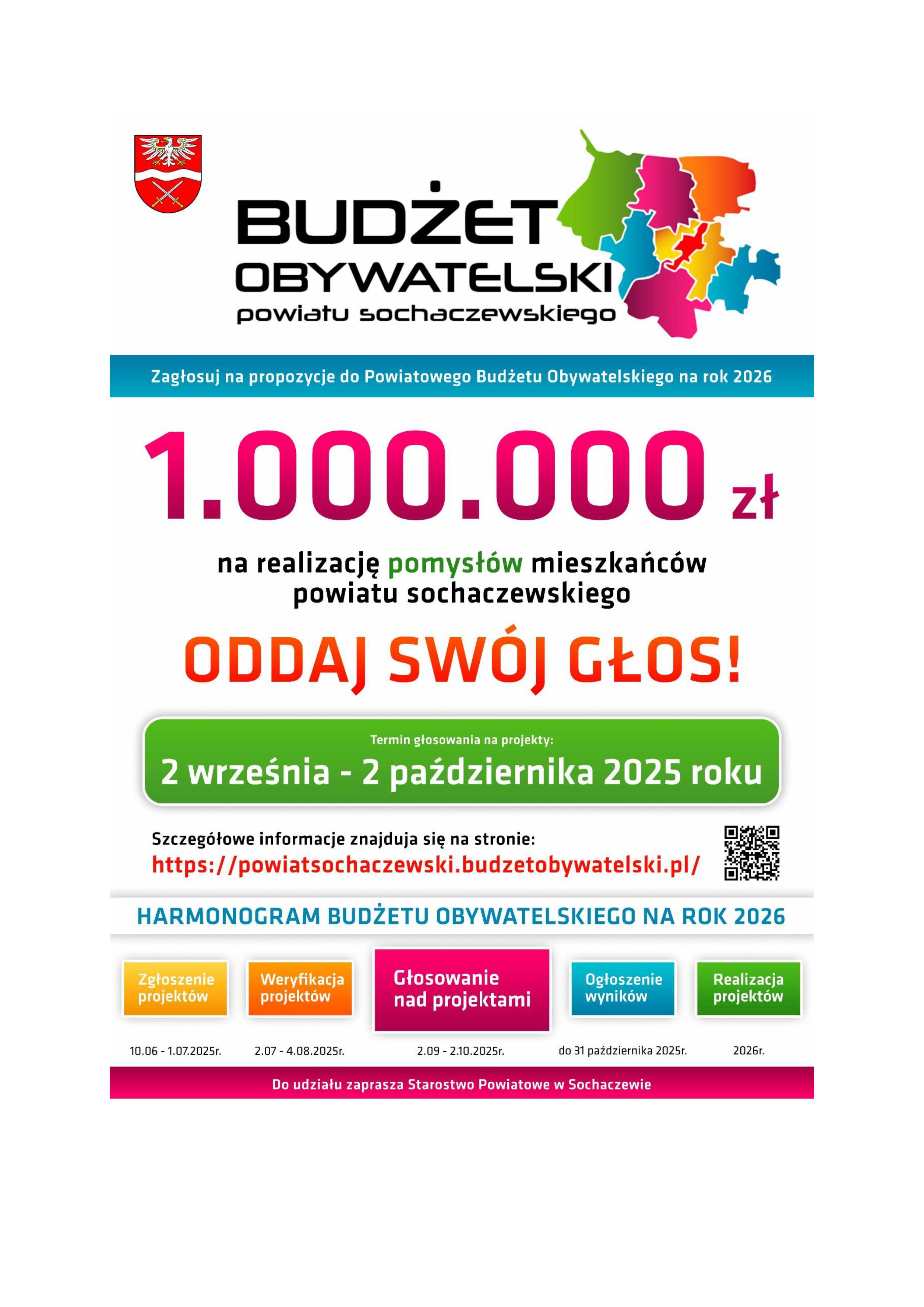 Starostwo Powiatowe w Sochaczewie zaprasza do udziału w kolejnej edycji Powiatowego Budżetu Obywatelskiego. Głosowanie rozpocznie się 2 września 2025 r. Więcej informacji można znaleźć na plakacie oraz na stronie internetowej: https://powiatsochaczewski.budzetobywatelski.pl/. Przedstawiono wyniki weryfikacji formalnej i merytorycznej wniosków, a wśród nich projekt „Kino pod Chmurką. Cykl spotkań plenerowych w Gminie Iłów”.