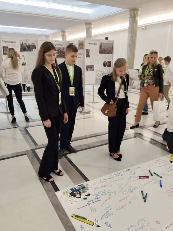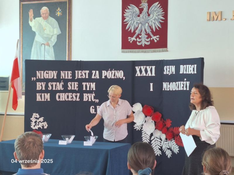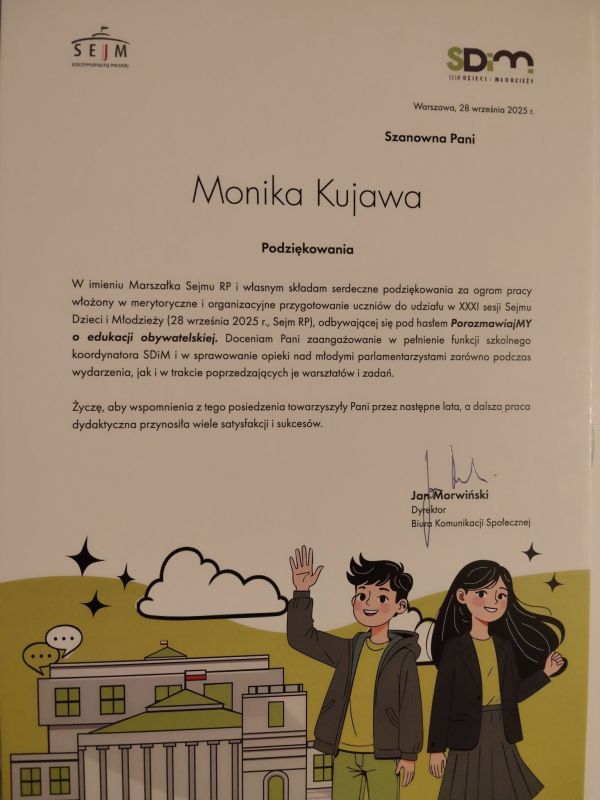 A pomniejsz czcionkę A standardowy rozmiar A powiększ czcionkęZ dumą informujemy, że Szkoła Podstawowa im. Marszałka Józefa Piłsudskiego w Iłowie została wylosowana do udziału w XXXI sesji Sejmu Dzieci i Młodzieży – prestiżowego projektu edukacyjnego organizowanego przez Kancelarię Sejmu we współpracy z Ministerstwem Edukacji Narodowej. Losowanie, które objęło wszystkie szkoły podstawowe w Polsce, odbyło się 4 czerwca 2025 r. z zachowaniem proporcjonalnego podziału na województwa. Spośród setek placówek wybrano 153 szkoły, które otrzymały szansę uczestnictwa w tym wyjątkowym wydarzeniu. Nasza szkoła znalazła się w tym zaszczytnym gronie – co jest ogromnym wyróżnieniem dla całej społeczności lokalnej. Z tej okazji mieliśmy zaszczyt gościć w naszej szkole Przedstawicieli Kancelarii Sejmu, którzy przyglądali się pracom związanym z organizacją losowania delegatów. Ich obecność była dla nas nie tylko potwierdzeniem rangi projektu, ale także inspiracją do dalszego zaangażowania w działania obywatelskie. Co więcej, pracownicy Kancelarii nagrali relację z naszego spotkania oraz z procesu wyboru delegatów na XXXI posiedzenie Sejmu Dzieci i Młodzieży. Materiał ten stanowi nie tylko dokumentację wydarzenia, ale także piękną pamiątkę, która pokazuje, jak aktywnie i z pełnym zaangażowaniem nasza młodzież uczestniczyła w tym obywatelskim przedsięwzięciu. Całość przedsięwzięcia odbyła się pod czujnym okiem Pani Dyrektor Elżbiety Kopki, która z pełnym zaangażowaniem czuwała nad organizacją projektu, wspierając każdy jego etap. Koordynacją działań zajmowała się Pani Monika Kujawa – z pasją i ogromnym profesjonalizmem prowadziła przygotowania, dbając o każdy szczegół. Niezastąpioną pomocą służyła również Pani Ewa Grzywacz, której wsparcie organizacyjne i wychowawcze odegrało istotną rolę w sukcesie całego przedsięwzięcia. Dzięki ich wspólnej pracy uczniowie mogli przeżyć niezapomnianą przygodę obywatelską, która na długo pozostanie w ich pamięci. Po potwierdzeniu udziału rozpoczęliśmy intensywne przygotowania. Między czerwcem a wrześniem przeprowadziliśmy akcję informacyjną wśród uczniów klas VI–VIII, promującą ideę Sejmu Dzieci i Młodzieży oraz zachęcającą do zgłoszeń. Następnie odbyło się szkolne losowanie, w wyniku którego wyłoniono naszych reprezentantów: Amelię Nowakowską, Patrycję Janiak i Filipa Wasilewskiego. W ramach przygotowań do sesji zorganizowaliśmy debatę szkolną poświęconą edukacji obywatelskiej – tematowi przewodniemu XXXI edycji SDiM. Uczniowie dyskutowali o tym, co ich zdaniem powinno się zmienić w edukacji obywatelskiej, jakie wartości są najważniejsze i jakie przeszkody utrudniają młodzieży aktywne uczestnictwo w życiu społecznym. Zorganizowaliśmy również akcję wykraczającą poza mury szkoły, angażując lokalną społeczność, pana Wójta Gminy Jana Pawła Kraśniewskiego w rozmowę o obywatelskości. Nasi przedstawiciele wzięli udział w warsztatach online organizowanych przez Kancelarię Sejmu, a następnie – w dniach 27–28 września 2025 r. – udali się do Warszawy, by zasiąść w ławach sejmowych i uczestniczyć w obradach Sejmu Dzieci i Młodzieży. Koszty transportu pokryło kuratorium oświaty, a zakwaterowanie i wyżywienie zapewniła Kancelaria Sejmu. Otwarcie posiedzenia poprowadził Marszałek Sejmu Szymon Hołownia, który w swoim przemówieniu zachęcał młodych parlamentarzystów do wyrażania opinii i dzielenia się głosem swojego pokolenia. W obradach towarzyszył im również Wicemarszałek Sejmu Krzysztof Bosak, który wspierał młodzież w ich obywatelskiej aktywności. Gościem specjalnym posiedzenia był Sławosz Uznański-Wiśniewski – drugi Polak w historii, który poleciał w kosmos. Astronauta opowiedział młodym parlamentarzystom o swojej misji i zachęcał ich do realizacji marzeń: „Kiedy byłem w waszym wieku, marzyłem o tym, żeby polecieć w kosmos. Dziś, jako uczestnik misji Ignis, mogę powiedzieć, że marzenia warto realizować. Marzenia się nie spełniają, marzenia się spełnia. Mam nadzieję, że z tej sali wyjdzie dziś nowa energia i pojawią się na niej marzenia sięgające gwiazd” – powiedział. Podczas posiedzenia młodzi posłowie debatowali nad najważniejszymi zagadnieniami związanymi z edukacją obywatelską. Wskazali m.in. na potrzebę obniżenia wieku wyborczego, przeciwdziałania wykluczeniu komunikacyjnemu, ułatwienia wejścia na rynek pracy oraz inwestycji w infrastrukturę sportową. Podkreślili również znaczenie patriotyzmu rozumianego jako szacunek do Ojczyzny, symboli narodowych, historii i miejsc pamięci. Zwrócili uwagę na konieczność praktycznej edukacji obywatelskiej – jak pisać petycje, głosować czy załatwiać sprawy urzędowe. Wyniki dyskusji zostały zebrane w specjalnej uchwale, którą młodzi posłowie przekazali marszałkowi Sejmu. Dokument trafi również do Rzecznika Praw Dziecka oraz Ministerstwa Edukacji Narodowej. W sobotę, dzień przed obradami, młodzież miała okazję zwiedzać Warszawę. W programie znalazły się m.in. Łazienki Królewskie – spacer po ogrodach, zwiedzanie Pałacu na Wyspie, Białego Domku oraz Pomnika Fryderyka Chopina. Uczniowie odwiedzili także Belweder, poznając jego historię i znaczenie dla polskiej państwowości. Szczególnym momentem było zatrzymanie się przy Pomniku Małego Powstańca – wzruszającym symbolu dzieci-żołnierzy walczących w Powstaniu Warszawskim. Pomnik przedstawia chłopca w za dużym hełmie i z karabinem, przypominając o odwadze najmłodszych uczestników walki o wolność. To miejsce skłaniające do refleksji nad historią i ceną pokoju.