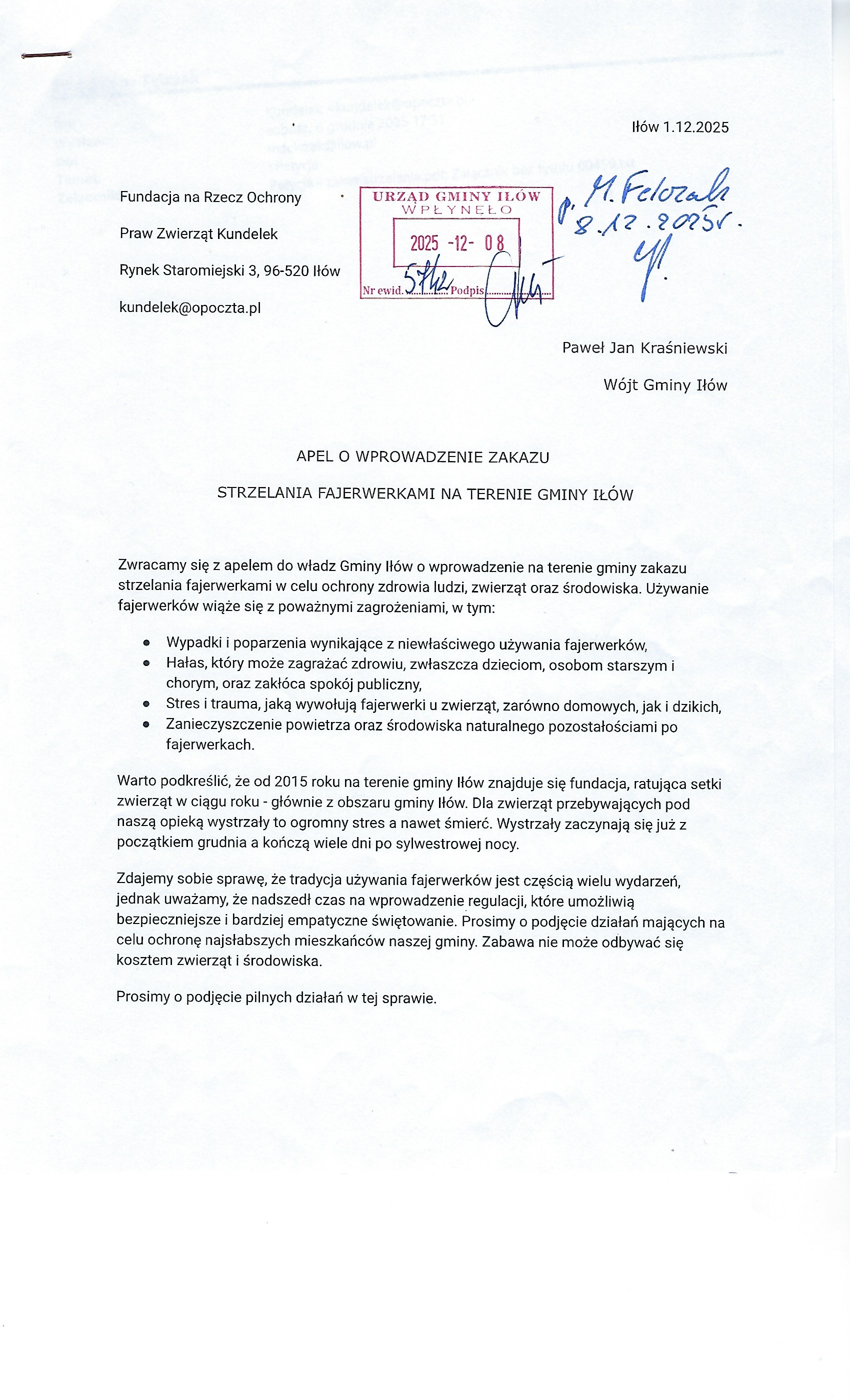 Wójt Gminy Iłów podaje do publicznej wiadomości Apel otrzymany od Fundacji na Rzecz Ochrony Praw Zwierząt Kundelek dotyczący wprowadzania zakazu strzelania fajerwerkami na terenie gminy Iłów.